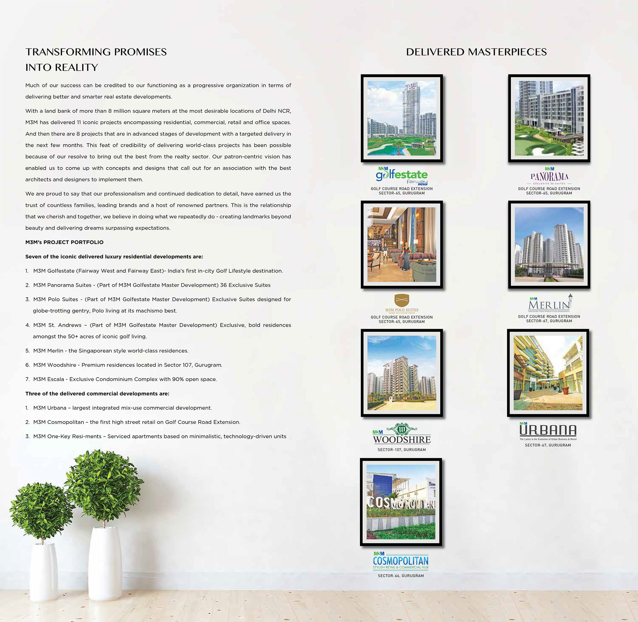 Disclaimer:- Welcome to M3M 65th Avenue (“Website”). The contents of this website are for general informational purposes only. By using or accessing this Website and/or the hyperlinks embedded/ mentioned in the Website you agree to abide by the terms and conditions, as set forth herein and as contained in the Website without any qualification or limitation. In the event you do not accept/ agree to the terms of this Disclaimer, you are requested not to use the Website or download materials from the Website. Every endeavor has been made to keep the information updated. However, we make no representations or warranties of any kind, express or implied, about the completeness, accuracy, reliability, suitability or availability with respect to the Website or the information, products, services, or related graphics contained in the Website for any purpose. The Website and all its content are provided on an “as is” and “as available” basis and is intended for informational purposes only. No information given under this Website shall be treated as a warranty or representation by us. Your use of the Website is solely at your own risk. This Website is for guidance only. It does not constitute part of an offer or contract. The contents, including design and specifications are subject to change without prior notice. Computer generated images are the artist’s impression and are an indicative of the actual designs. By using and/or accessing this Website, you, the viewer/user acknowledge that the information including any material/ documents (such as brochures and marketing collaterals) on this Website are solely for informational purposes and you have not relied on this information for making any booking/ purchase/ intention to purchase/ invest in any project(s) of M3M INNOVATION PARK and/or its affiliates. Nothing herein shall be construed as any invitation, or offer for investment or deposit within the terms of the applicable law (as amended from time to time) including without limitation SEBI Act, 1992, Companies Act 2013 etc. and we shall not be liable for any consequence of any action taken by the viewer relying on such material/ information on this Website. The particulars contained on the Website mention details of Projects/ developments undertaken by M3M INNOVATION PARK and/or its affiliates. The contents are being modified in terms of the stipulations/ recommendations under the Real Estate Regulation Act, 2016 and Rules made thereunder (“RERA”) and accordingly may not be fully in line thereof as of date. Use of information shall be governed by Indian laws, RERA; subject to jurisdiction of Competent Authority under RERA, courts at Gurugram/ Haryana India. You are further advised to verify all the details, including area, amenities, services, terms of sales and payments and other relevant terms independently with the sales team independently, subject to prior appointment during working hours and speak to one of our sales staff, prior to concluding any decision for buying any unit(s) in the said project. In no event shall M3M INNOVATION PARK, its affiliates, employees, directors and/or officers be made liable for any claim as a result of any inaccuracies in the information provided in this Website, though all efforts have to be made to ensure accuracy and under no circumstances shall we be liable for any expense, loss or damage including, without limitation, indirect or consequential loss or damage, or any expense, whatsoever arising from use, or loss of use, of data, arising out of or in connection with the use of this Website.